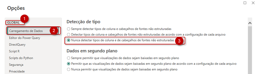 Por isto, minha recomendação em cursos e treinamentos, desde sempre, e agora aqui também, em canal público, acessível a todos os interessados, é de que as configurações do Editor de Consultas do Power Query sejam alteradas, para que NUNCA detectem os tipos de dados para fontes não estruturadas.